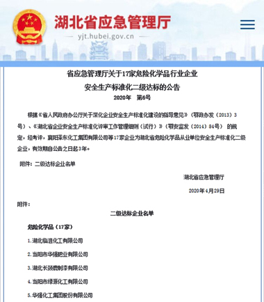 日前,湖北省应急管理厅官网公告了危险化学品行业安全生产标准化二级达标企业名单,我公司及下辖华强肥业、临沮化工、绿源化工三家子公司均名列其中。