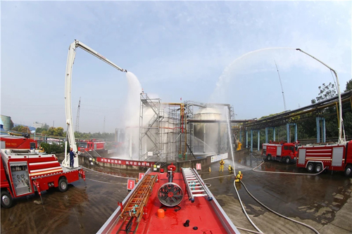 救援第一阶段,我公司迅速启动公司级应急预案,开启自动喷淋装置,开展工艺倒罐处置,公司专职消防队赶赴现场对泄漏点进行稀释。