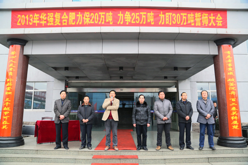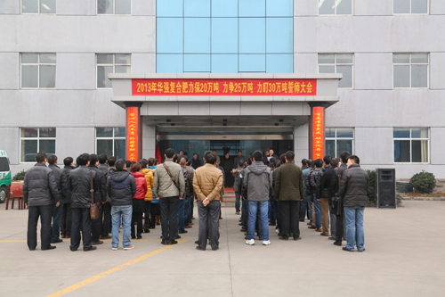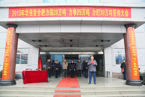 锣鼓声声,鞭炮阵阵。2013年农历正月初八上午,华强复合肥力保20万吨、力争25万吨,力盯30万吨誓师大会在生产销售大楼广场如期举行。集团公司董事长、总经理余华强同志率公司领导一行出席誓师大会,为农贸公司磷复肥分公司全体干部员工70人壮行。